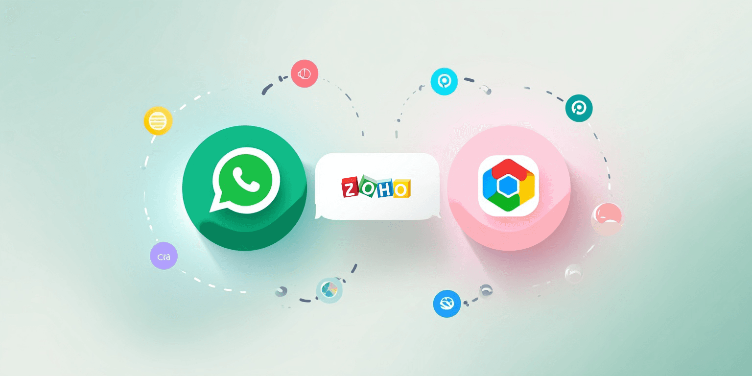 Visual: Zoho logo and WhatsApp logo connected by dotted arrows to a central hub icon.