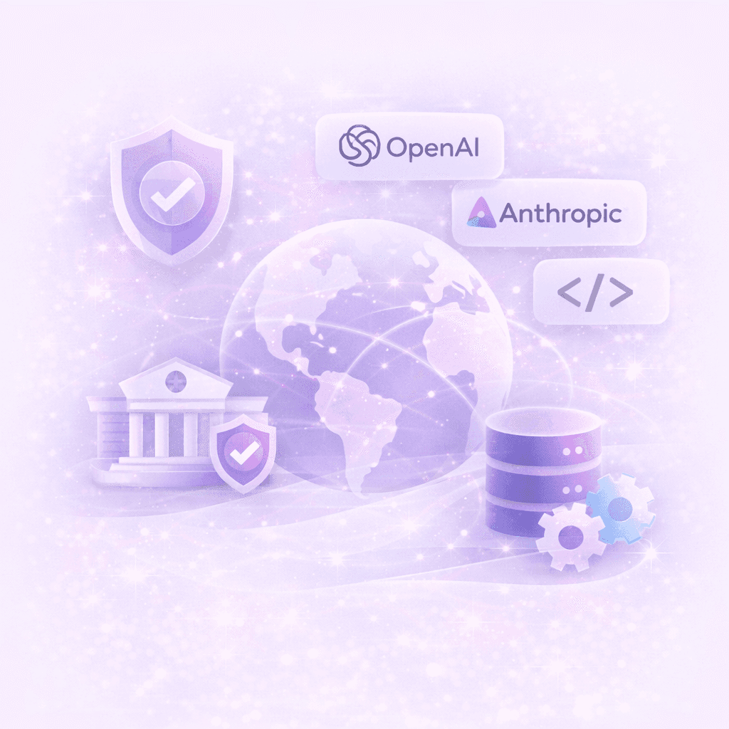 The Application Layer connects to the organisation’s chosen AI infrastructure provider. This may include models and ecosystems such as OpenAI, Anthropic, Google, Azure, or regionally hosted LLMs.
