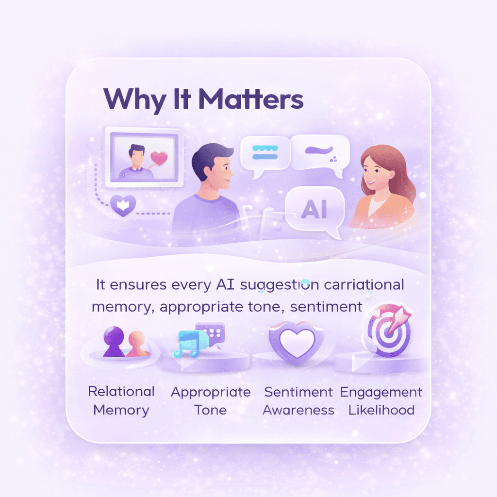 It ensures that every AI suggestion carries relational memory, appropriate tone, sentiment awareness, and an understanding of engagement likelihood. This is what makes A&B unique: AI that behaves with emotional intelligence and organisational awareness.