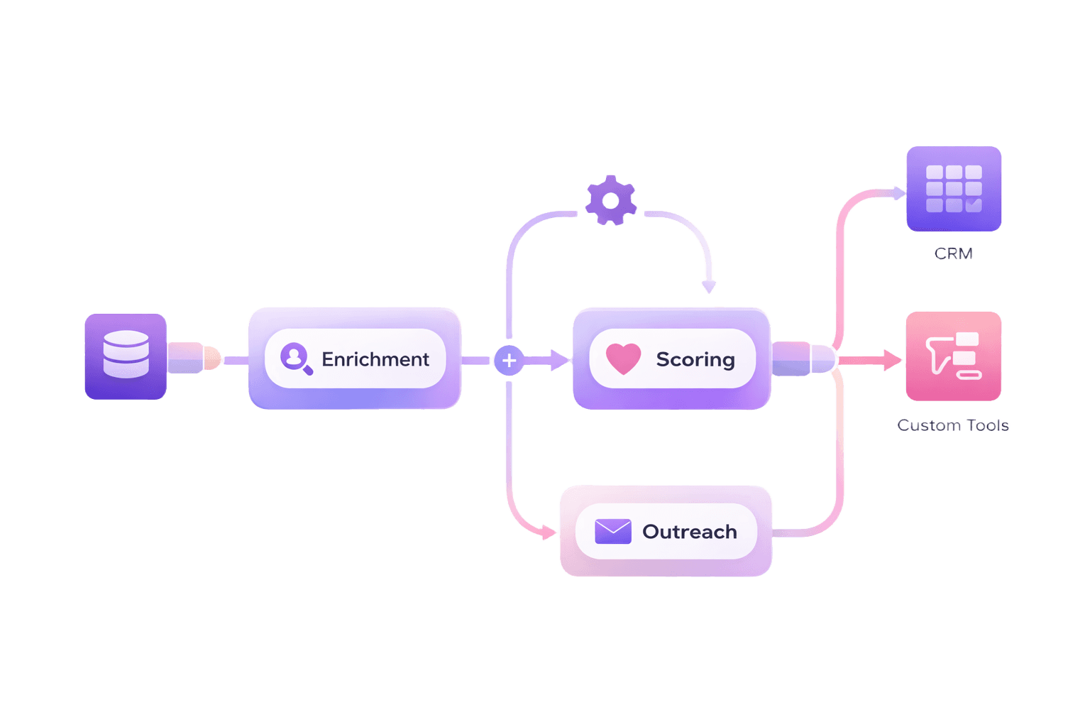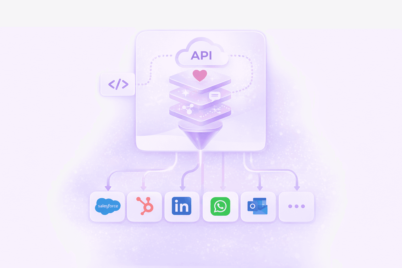 It receives enriched insights from the A&B intelligence layer, such as engagement scores, recommended follow-ups, tone and sentiment analysis, and relationship maps. It sends these insights back into tools like Salesforce, HubSpot, LinkedIn, WhatsApp, Outlook, or internal applications.